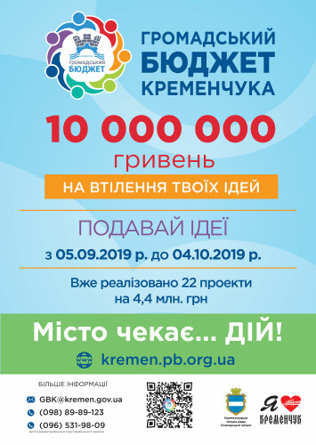 Цього року вже 10 млн. грн. виділено на ваші ідеї і кожен громадянин від 14 років може подати свій проект на Громадський бюджет Кременчука. Майбутні автори можуть подавати свої ідеї у 4 категоріях проектів - по 1 проекту в кожній - Великі, Комунальні, Малі та Соціальні проекти.